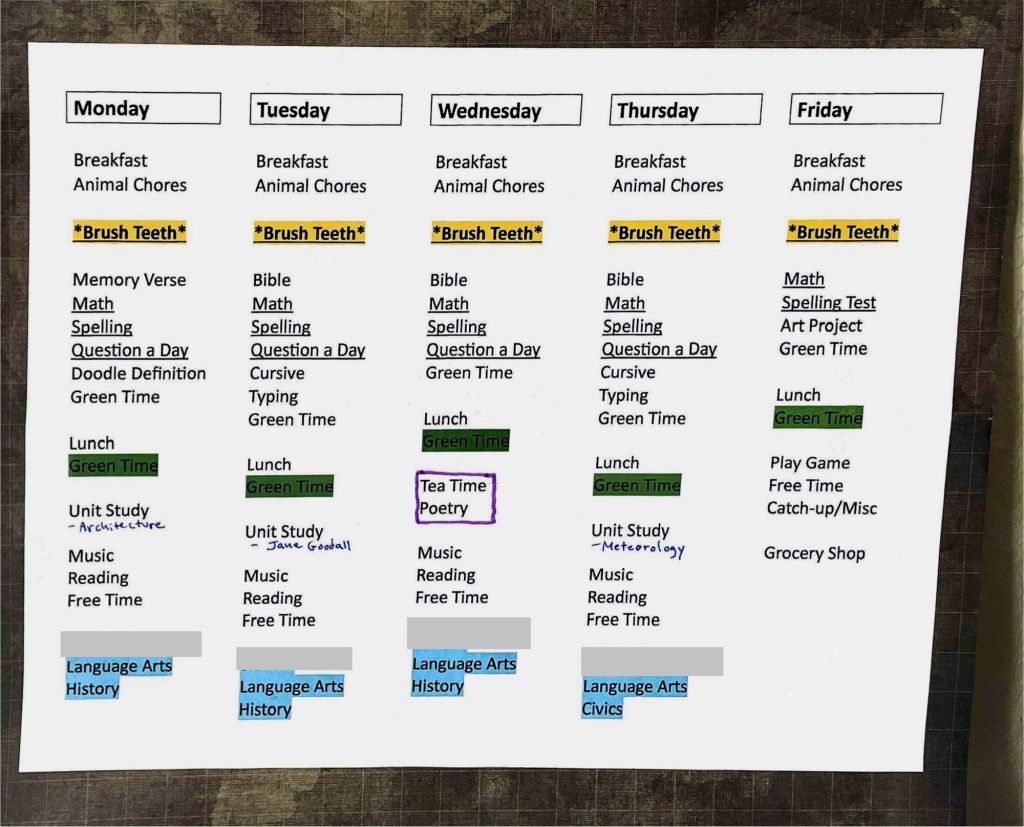 For Spring Semester 2024, I made a few changes to our homeschool routine. One of the biggest changes was adding Wednesday tea and poetry. I took out some workbook time to fit it in. Another change was switching between 3 different unit studies, instead of sticking with one until it was completed, like we did with space science last semester. I’m afraid I get bored easily, and it’s easier to be consistent with doing our unit study if it’s a different topic every day.