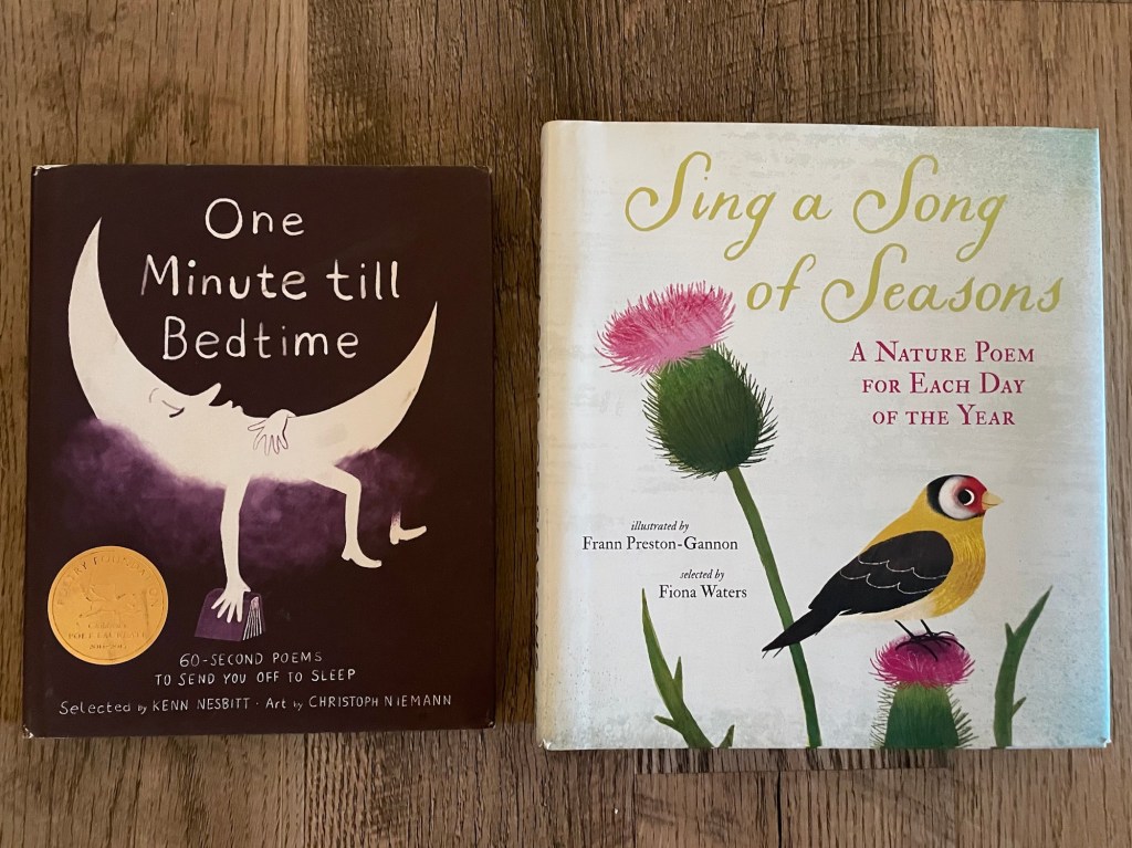My favorite anthologies of poetry for kids are Sing a Song of Seasons and One Minute till Bedtime: 60-Second Poems to Send You off to Sleep.
