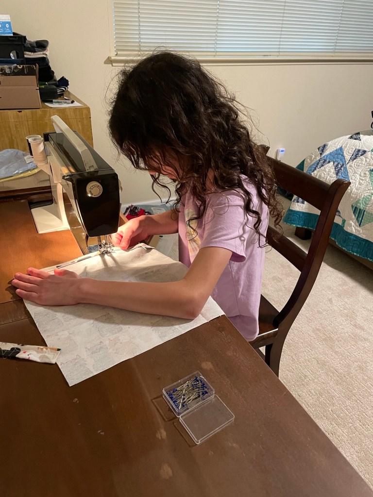 My daughter and I practiced first. Sewing right now is a one-on-one project. She chose to make the front pocket into two pockets by sewing a seam down it slightly to one side. One side of the pocket is for a book and the other side is for her watch. Pajama pants in the cute kitten fabric are next up on her project list. I cut the fabric with the rotary cutter. I probably should’ve let her do it but… I didn’t… rotary cutters make me nervous. I guess I could’ve drawn lines on the fabric and let her cut it with fabric scissors, but I didn’t think of that until just now! 🤦🏻‍♀️ She did all the sewing on my sewing machine though!
