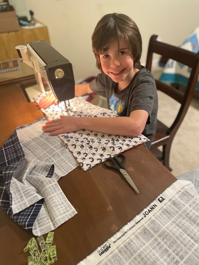 My son wanted to go next. Of my three children, he has the shortest attention span. This project was just within his attention limits. Again, I cut all the pieces and he did 99% of the sewing. He liked his sister’s pocket sizes and followed suit. Next, he’ll be making navy blue plaid pajama pants with penguin cargo pockets.
