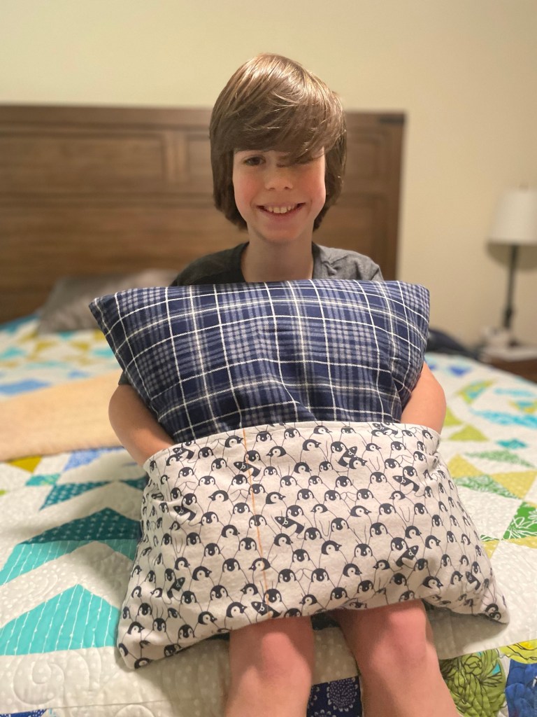 My other son graciously took the last turn to make his pillow. He’s almost 14, and he has lots of patience, fine motor skill, and attention to detail. He whipped this up pretty quickly. The two pocket style was the preferred pocket style of all three kiddos. As an aside, one of his favorite movies is “Cool Runnings” (1993) starring John Candy and Doug E. Doug. It’s based on a true story about the 1988 Jamaican bobsled team. He handmade his custom beanie using the colors of the Jamaican flag.
