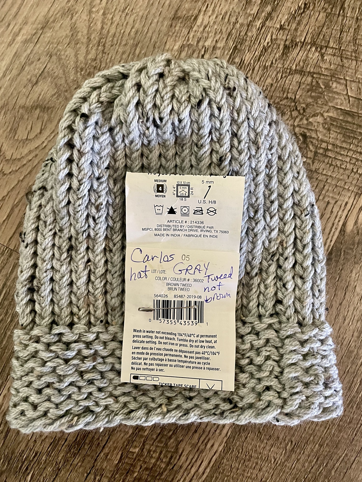 I bought some yarn at the thrift store and when I got it home, I noticed this note on the label: “Carlos hat, gray tweed not brown”.