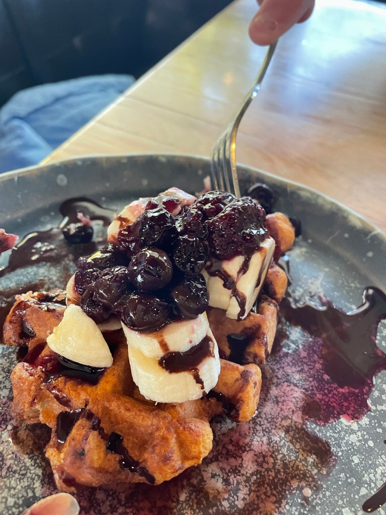 banana & berry compote waffle with a dark chocolate drizzle