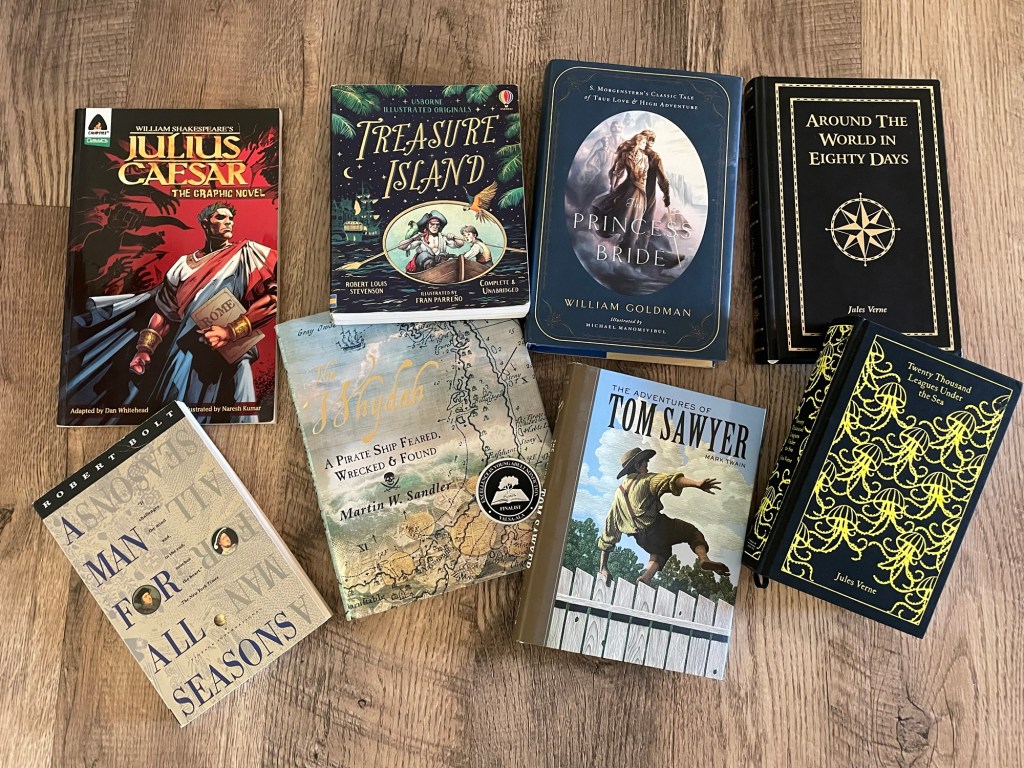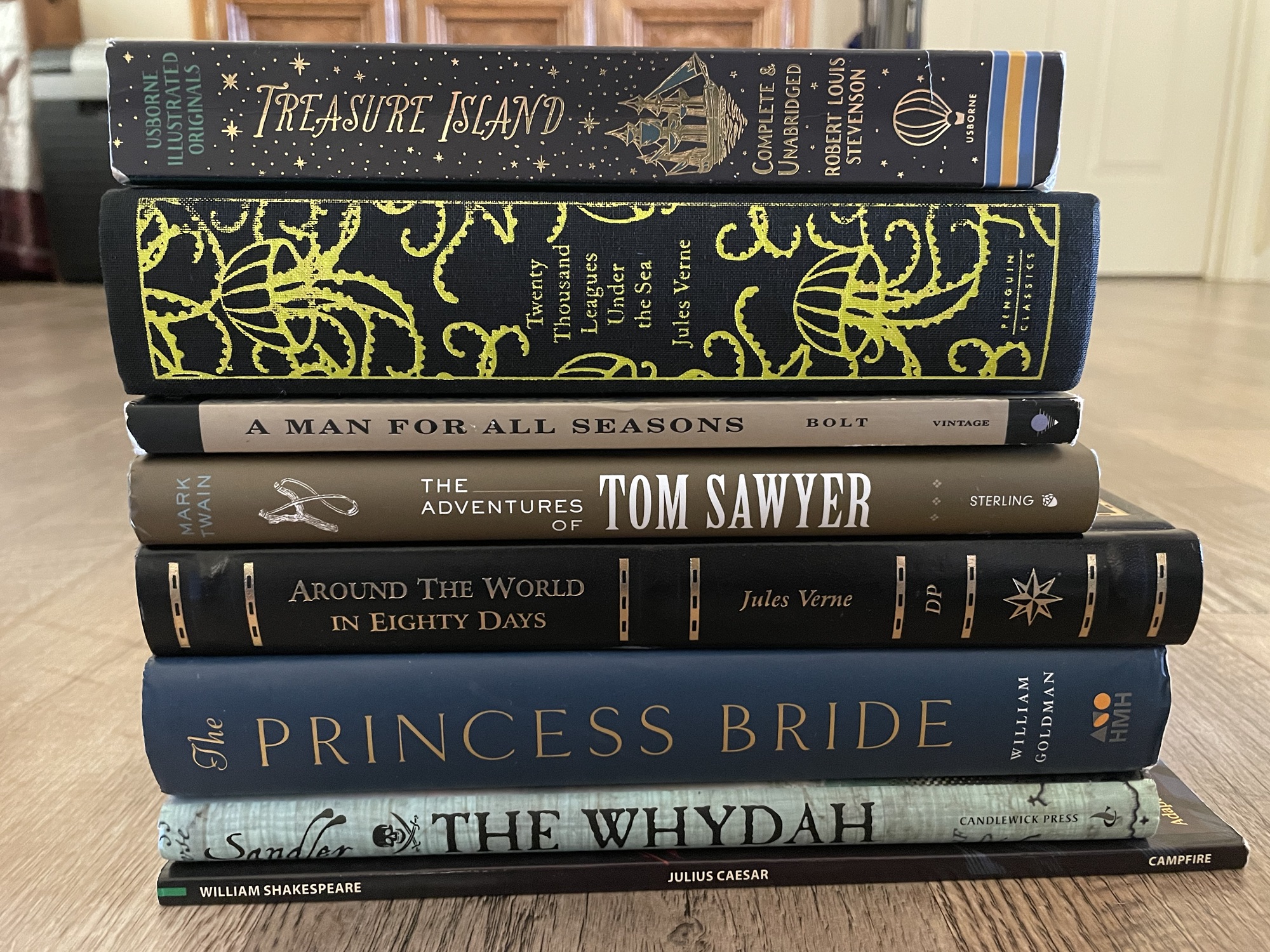 I purchased “Julius Cesar” as a graphic novel. We recently finished “Twenty Thousand Leagues Under the Sea” on Audible. I’m planning on reading “The Princess Bride” aloud. We listened to “Treasure Island” this past summer. I read “Around the World in 80 Days” aloud a few years ago. I’m thinking that an additional assignment for reading “Tom Sawyer” will be to create a redacted version that’s cleaned up to today’s standards. I think I had “A Man for All Seasons” as required reading when I was in high school but I don’t remember it. My son initially balked at “The Whydah” but ended up enjoying it since he loves true information, factual type books.
