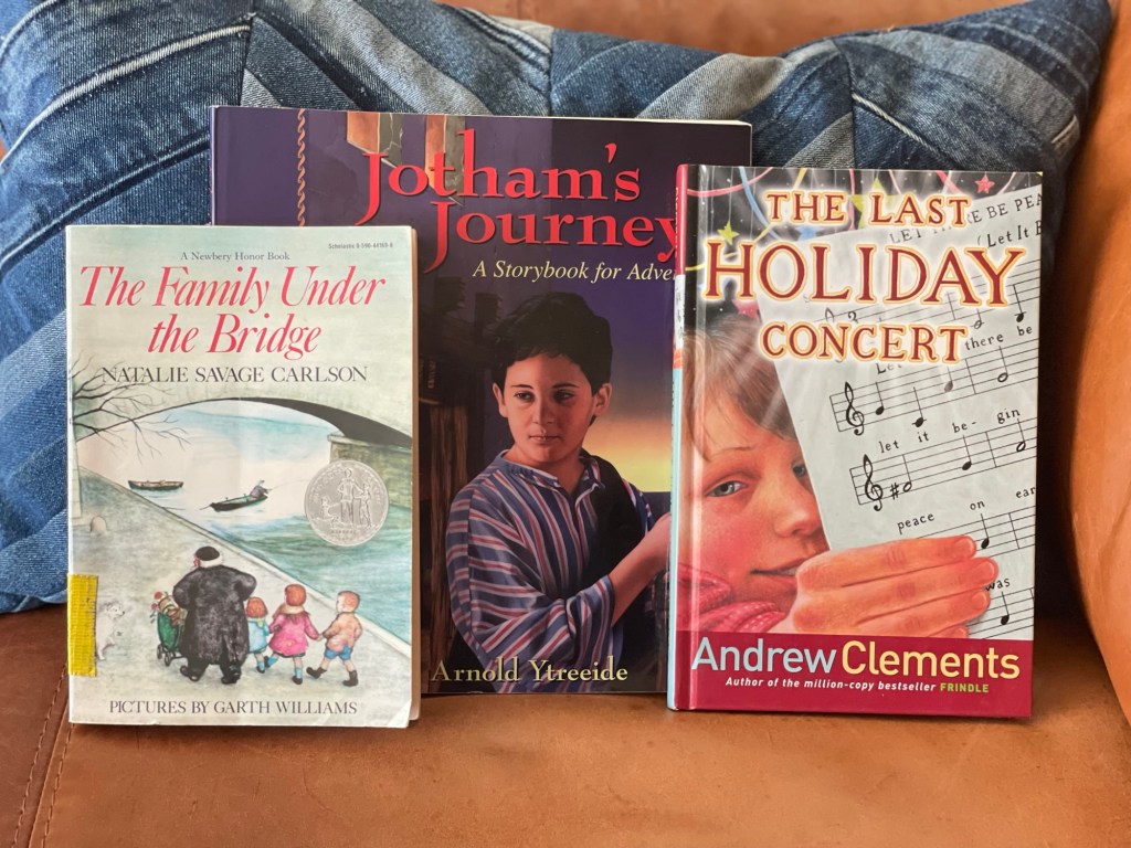 Read a book that has a wintry cover: “The Family Under the Bridge” by Natalie Savage Carlson
