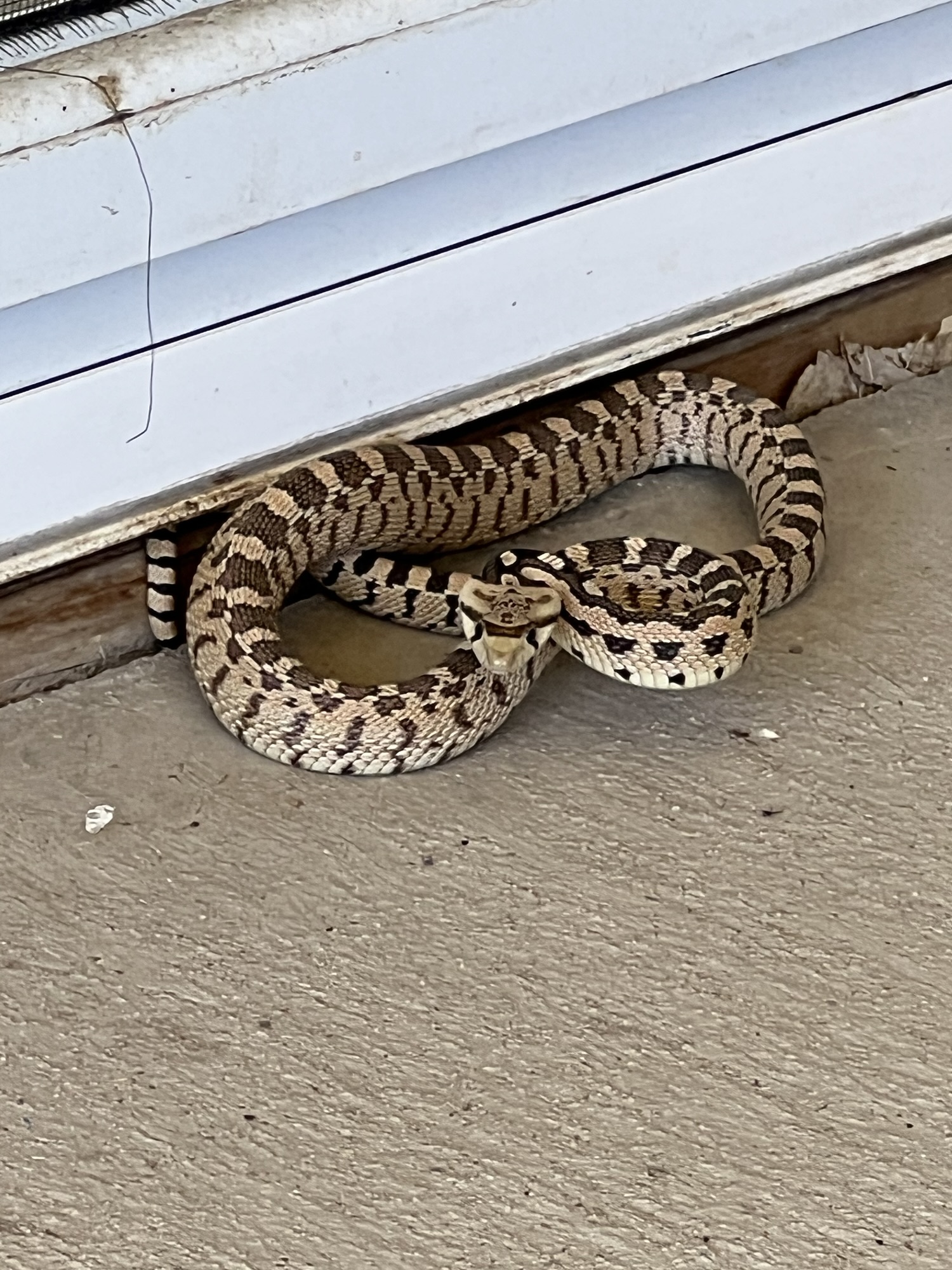 1. Gopher snakes mimic rattlesnakes as a defense mechanism. My husband had accidentally frightened this one by opening the back sliding door quite suddenly and it was in full fight mode! Of course, the snake accidentally frightened my husband at the same time! It took a little bit to observe and recognize that it was a gopher snake. We kept him as a “pet” who possibly still lives somewhere in our yard to eat rodents. 😁