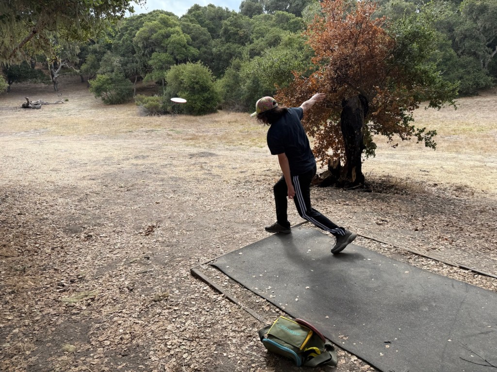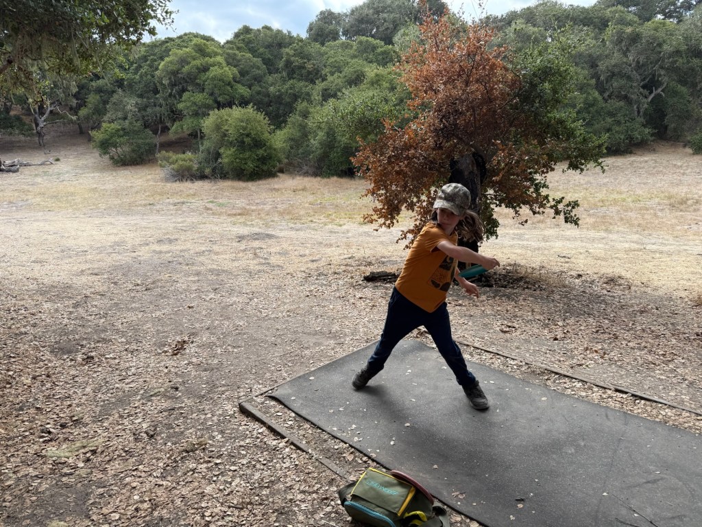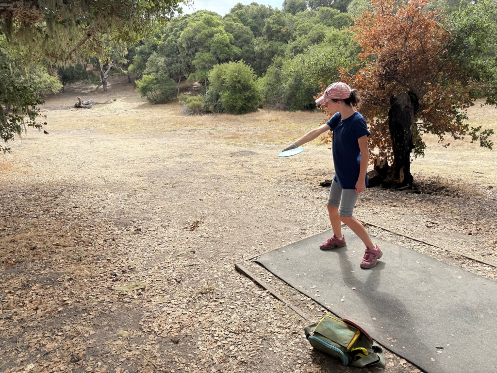 Our trip to the Monterey Peninsula included a morning spent at Ryan Ranch Disc Golf Course. We played 9 holes with 7 people. We divided ourselves into two teams and played a scramble. In a scramble, each player takes a turn throwing their disc and congratulates the person on their team who threw the best shot. Then everyone on the team gets to throw their next disc from that best point. Play continues in this way until a player from each team gets a disc into the basket/hole.