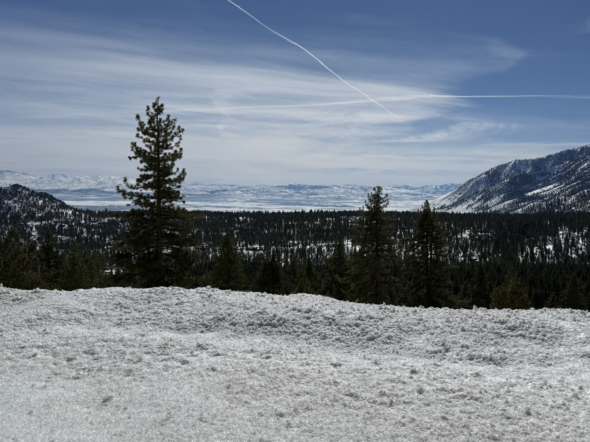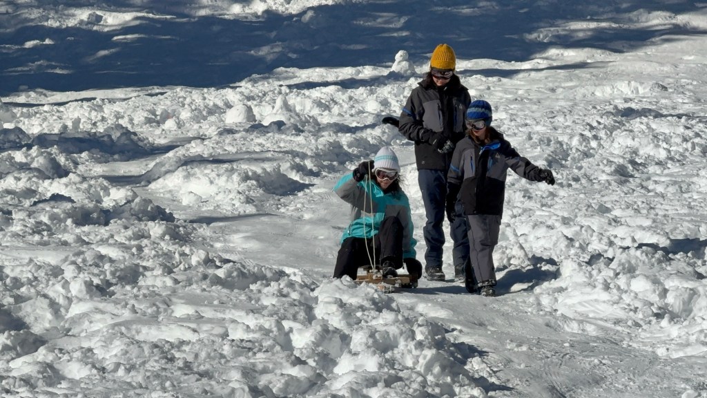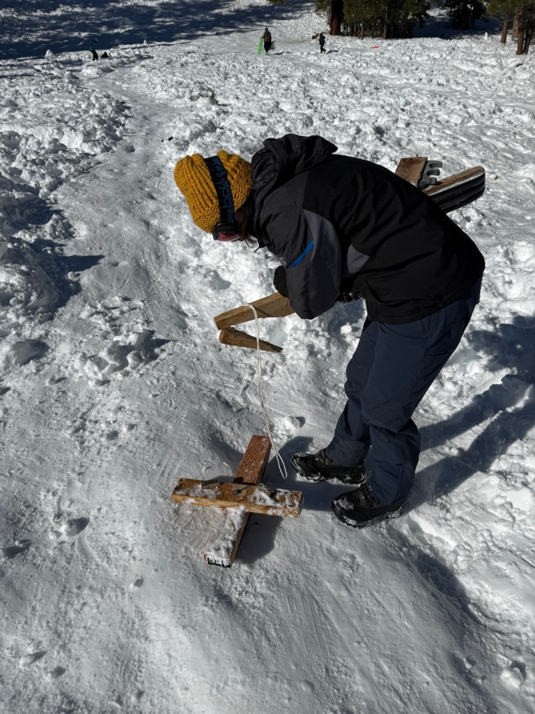 We hiked and sledded for about 2 hours. My husband and I guess we went somewhere between 1/2 – 1 mile. Let’s call it at 3/4 of a mile? 🤷🏻♀️ It was hard to tell because we were climbing through deep (3 feet) wet snow (Sierra cement) with steep elevation gain at 7,000 ft above sea level.