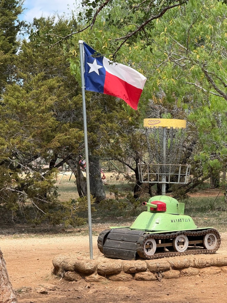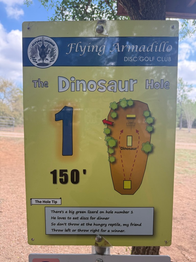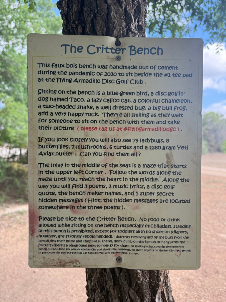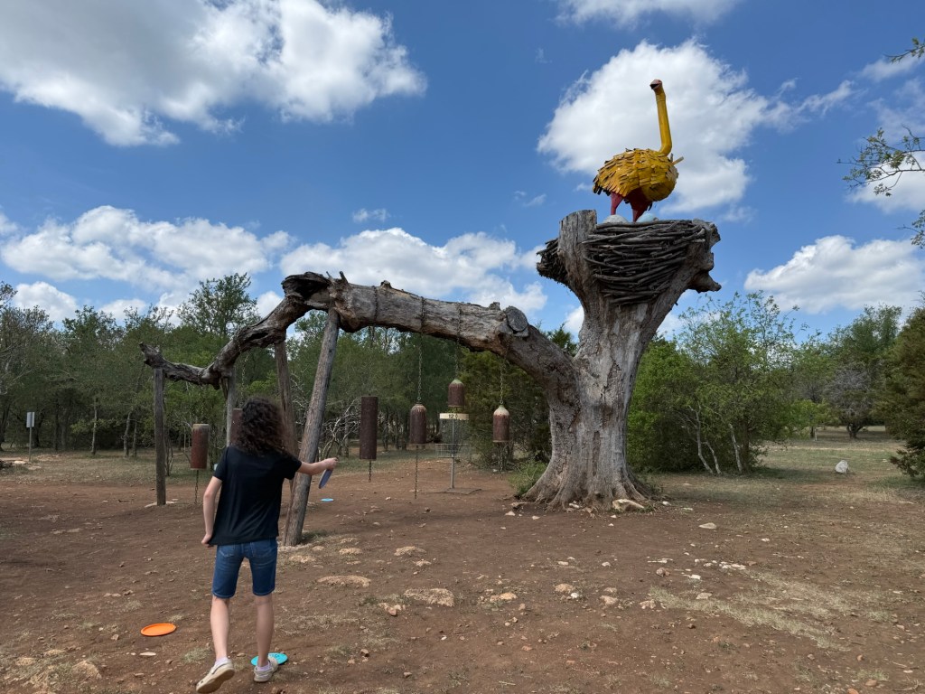 My husband had a work conference in Austin, TX and the kiddos and I got to tag along. Our first day there we went to nearby San Marcos to play disc golf at Flying Armadillo Disc Golf Club. This place was really awesome. Each hole on the 18-hole putt-putt course was incredibly unique and creative with a throwing tip in poetry too! Most holes had a beautiful piece of art next to the tee pad. There was also a standard course and my youngest played the first 4 holes. It cost $10 per person to play at both courses all day for ages 12+ and my youngest son was free (he’s 11). Here’s a few favorite photos.