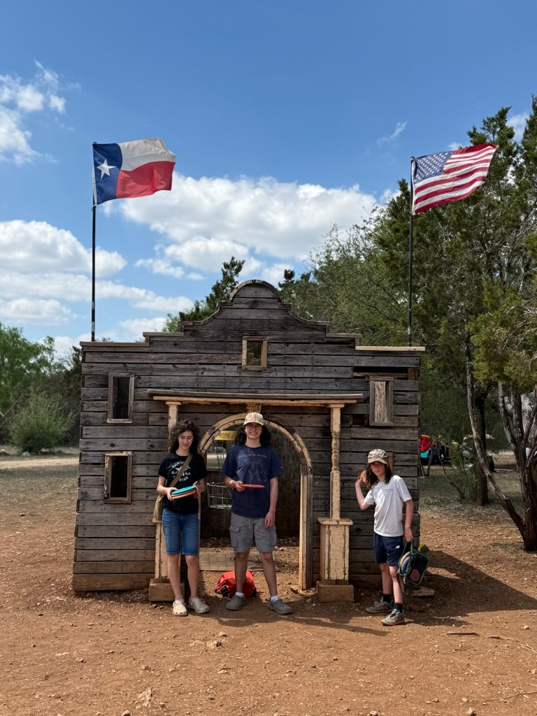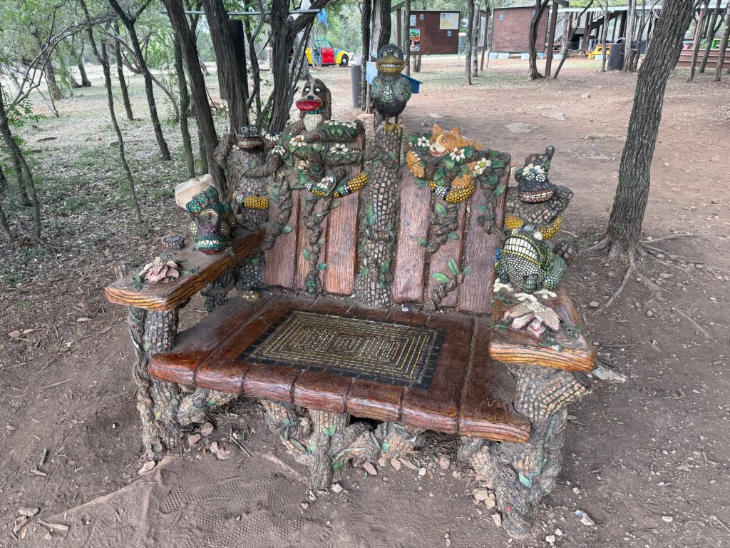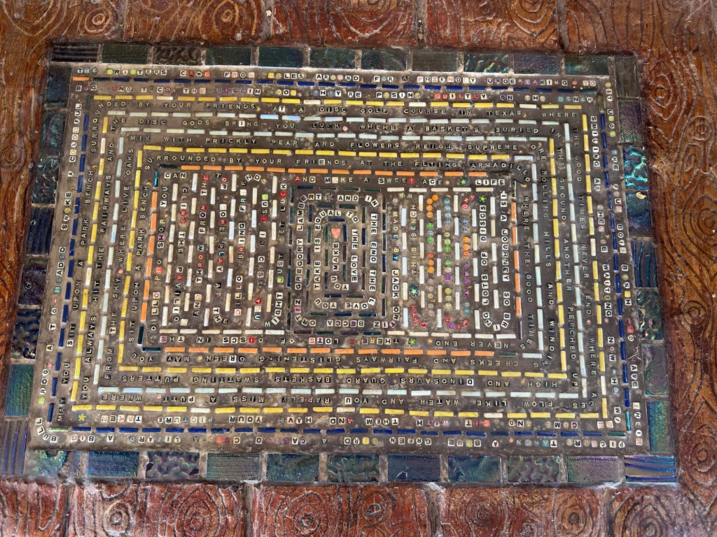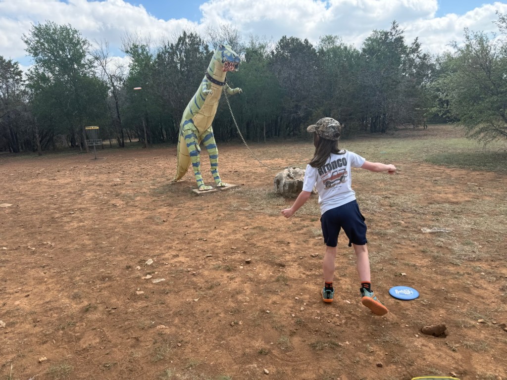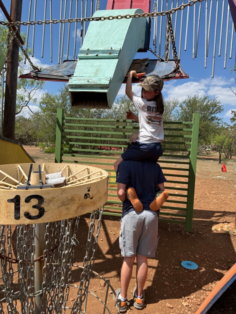 My husband had a work conference in Austin, TX and the kiddos and I got to tag along. Our first day there we went to nearby San Marcos to play disc golf at Flying Armadillo Disc Golf Club. This place was really awesome. Each hole on the 18-hole putt-putt course was incredibly unique and creative with a throwing tip in poetry too! Most holes had a beautiful piece of art next to the tee pad. There was also a standard course and my youngest played the first 4 holes. It cost $10 per person to play at both courses all day for ages 12+ and my youngest son was free (he’s 11). Here’s a few favorite photos.