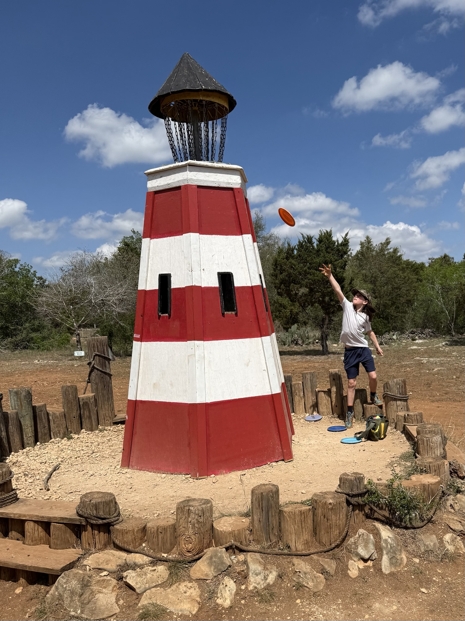 My husband had a work conference in Austin, TX and the kiddos and I got to tag along. Our first day there we went to nearby San Marcos to play disc golf at Flying Armadillo Disc Golf Club. This place was really awesome. Each hole on the 18-hole putt-putt course was incredibly unique and creative with a throwing tip in poetry too! Most holes had a beautiful piece of art next to the tee pad. There was also a standard course and my youngest played the first 4 holes. It cost $10 per person to play at both courses all day for ages 12+ and my youngest son was free (he’s 11). Here’s a few favorite photos.