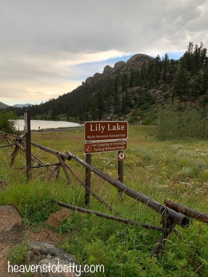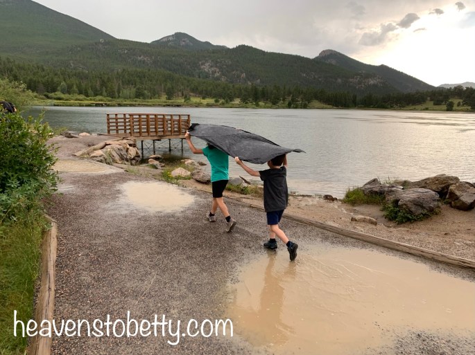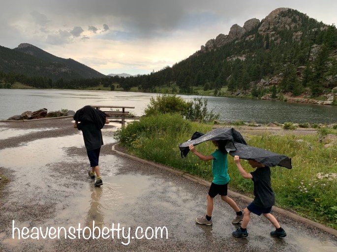Per the suggestion of the park ranger, we headed to Lily Lake for a short hike. Those clouds we’d noticed earlier, were nearer and darker now. By the time we got to the trailhead, it was pouring rain.