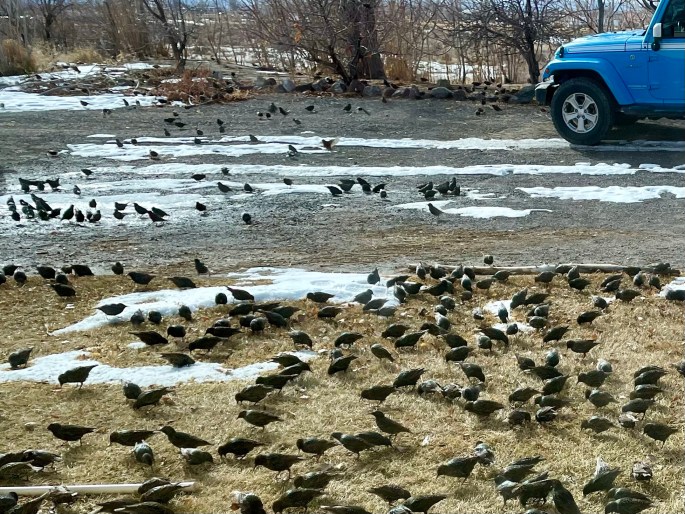 Photo credit my oldest son (age 13) with my iPhone. We heard a cacophony of chirping and looked out the window to discover hundreds of starlings in the front yard!