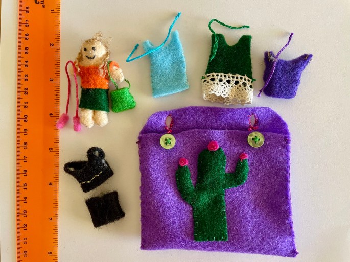My 11-year-old daughter has been enjoying hand sewing with felt. The other day, I took the boys for haircuts and she crafted this little cutie while she was home “alone” (with her dad working in his home office). The doll has several outfits and accessories like hair ties, a handbag, a jump rope, and a … Continue reading Handmade Mini Felt Doll