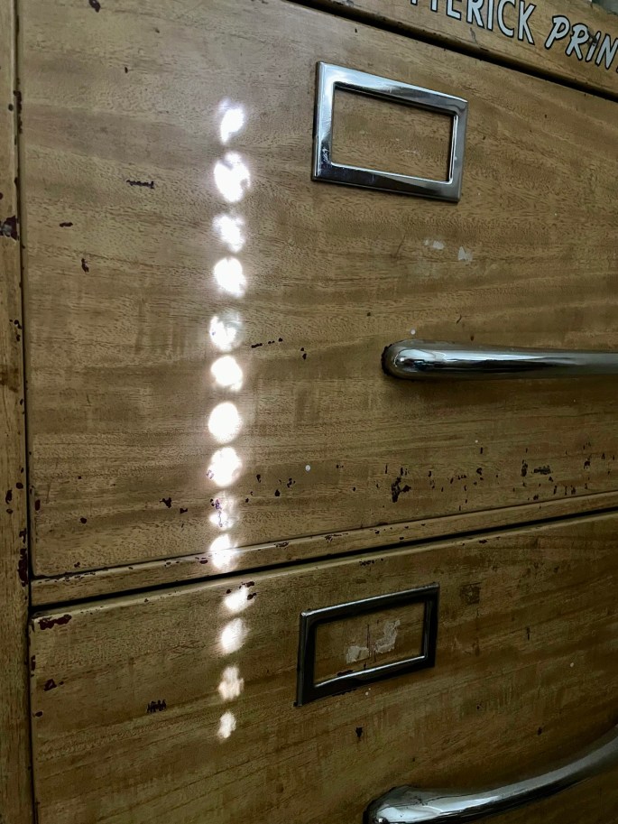 This pattern is created by the sunlight coming through the holes in the mini-blinds where they’re attached together by string. The piece of furniture is an old metal Butterick pattern cabinet that I use as a dresser.
